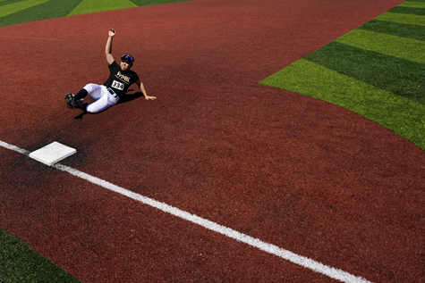 Rakyung Kim slides into third base during the first day of tryouts for the
