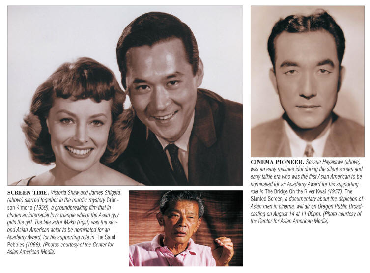 From The Asian Reporter, V17, #32 (August 7, 2007), page 11. Straightforward doc offers perspective of Asian-American men on cinematic portrayal The Slanted Screen Produced and directed by Jeff Adachi By Toni Tabora-Roberts Though it’s ground that’s been covered before in a variety of other venues, The Slanted Screen effectively brings to light some compelling perspectives on the depiction of Asian men in cinema. Directed by Jeff Adachi, a.k.a. San Francisco’s public defender, the film is narrated by actor Daniel Dae Kim (from TV’s "Lost") and features an interesting range of interviews, including late Oscar- nominated actor Mako, Hollywood producer Terence Chang, veteran playwright Frank Chin, comedian Bobby Lee, and director Justin Lin, as well as comments from casting director Heidi Levitt, and Lois Salisbury, former director of Children Now. The film opens from a relative high point for Asian men on film, highlighting the career of early screen star Sessue Hayakawa. Hayakawa starred in over 80 films in both Japan and the U.S. Though he had a lot of success — he was the first Asian nominated for an Academy Award, for his role as a sympathetic enemy commander in The Bridge On the River Kwai (1957) — he was also often typecast in roles as the exotic lover or wily villain. Movie star James Shigeta had great luck in his early career, garnering multi- dimensional roles in various films. About his character in Crimson Kimono (1959) Shigeta laughs, "Well, he wound up with the girl." He went on to star in the hit musical Flower Drum Song (1961), the first American film with an all-Asian cast. Unfortunately, most other actors had no such luck. Late actor Mako, who was the second Asian American ever nominated for an Academy Award, reveals a lot of frustration with the stereotypical roles available for Asian-American actors as well as anger at the "yellow-face" that was rampant in Hollywood. Mako recalls producers’ saying, "If we put a yellow man on the tube, audiences would turn off the set in five minutes," to justify their casting of Caucasian David Carradine in the lead role as the half-Chinese Shaolin priest in the TV series "Kung Fu." The film goes on to explore the de-sexualization of Asian-American men on screen. The nerdy, heavily accented character Long Duk Dong in Sixteen Candles (1984) haunts many young actors and Asian-American men. Comedian Bobby Lee ("Mad TV") joked that every Asian guy was called Long Duk Dong in high school. "That meant you’re not going to get any girls." The de-sexualization of Asian men led many to embrace more heroic and strong images, such as those created by the legendary Bruce Lee. Actor/director Phillip Rhee felt inspired by Bruce Lee’s ass-kicking characters. "We’re able to walk down the street with our heads up. He’s still a legend." Others, including Frank Chin, felt that Bruce Lee’s characters were just another stereotype. Actor Cary-Hiroyuki Tagawa countered, "If I’m going to choose between a wimpy business man and a bad guy, I’m going to play a bad guy, because I got balls. I want kids to grow up knowing Asian men got balls." The film offers some solutions and a sense of hope with a new generation of filmmakers such as Justin Lin, Eric Byler, and Gene Cajayon. Casting director Heidi Levitt suggests that what is needed is "more Asian writers, more well-defined Asian-American roles." Actor Tzi Ma encourages actors to pursue roles beyond just those pegged for Asian actors. "You have to go out there and say I want to be seen for an acting role, of any kind." All in all, this is a compelling documentary that shows an array of rarely seen film clips and interesting commentary from a range of voices, including the last onscreen interview with the late actor Mako. The Slanted Screen will air Tuesday, August 14 at 11:00pm on Oregon Public Broadcasting. For more information, or to verify show times, call (503) 293-1982 or visit <www.opb.org>. To learn more about the film, visit <www.slantedscreen.com>.
