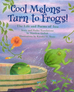 Matthew Gollub’s story and haiku translations are flawless. Kazuko G. Stone’s illustrations are charming, but it is her rendering of each haiku in Japanese that gives wings to this marvelous book. An author’s note includes not only the story of how Cool Melons — Turn to Frogs! was written and illustrated, and wonderful background information on haiku, but also Japanese transliterations of four of Issa’s poems and instructions on pronunciation to give the reader "an idea of what the poems sound like in the original Japanese."
